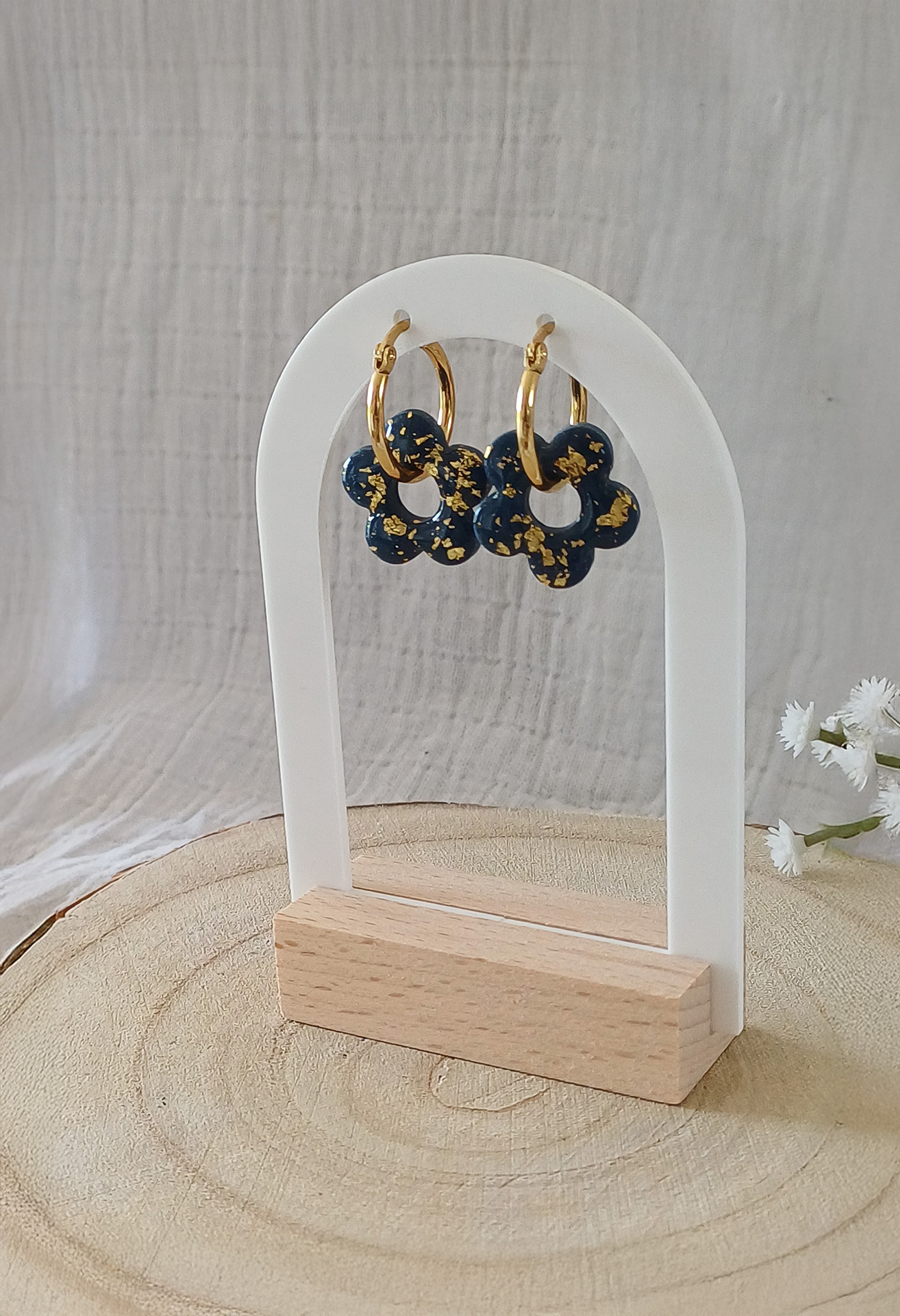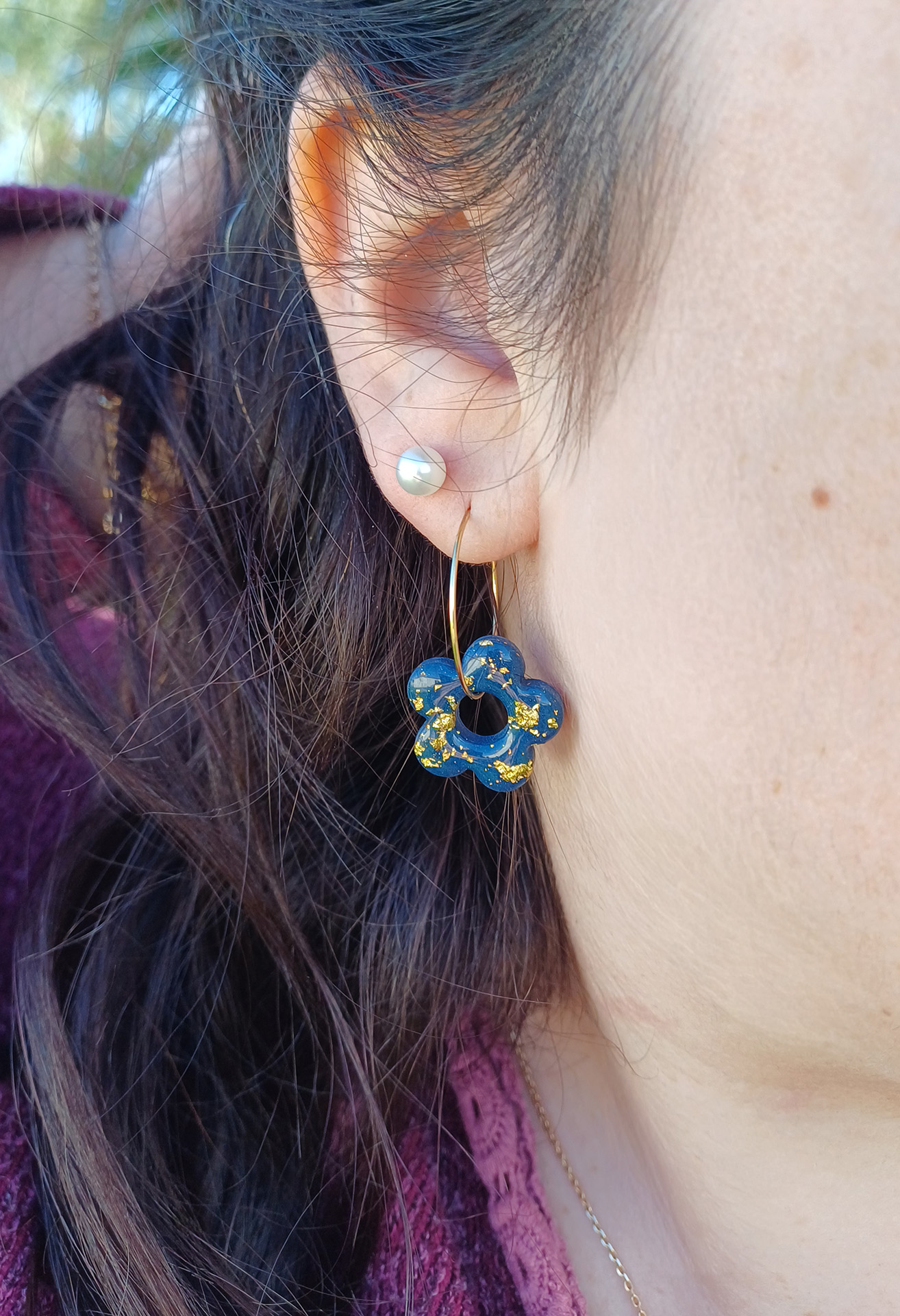 Apportez une touche poétique à vos looks avec les créoles avec fleurs interchangeables April. Ces boucles d’oreilles délicates se distinguent par une fine fleur à cinq pétales, de couleur bleu marine et parsemé de copeaux de feuille d’or, vernie avec de la résine UV pour un rendu brillant et lumineux. Cette fleur est posée sur une créole à choisir selon vos préférences. Inspirées par la nature, polyvalentes et confortables, elles sublimeront aussi bien une tenue décontractée qu’un style plus sophistiqué. Elles sont réversibles, d’un côté vous aurez une fleur parsemée de feuille d’or, de l’autre une fleur unie. Les créoles sont en acier inoxydable (sans plomb, sans cadmium, sans nickel), les pampilles, elles sont faites main en argile polymère.