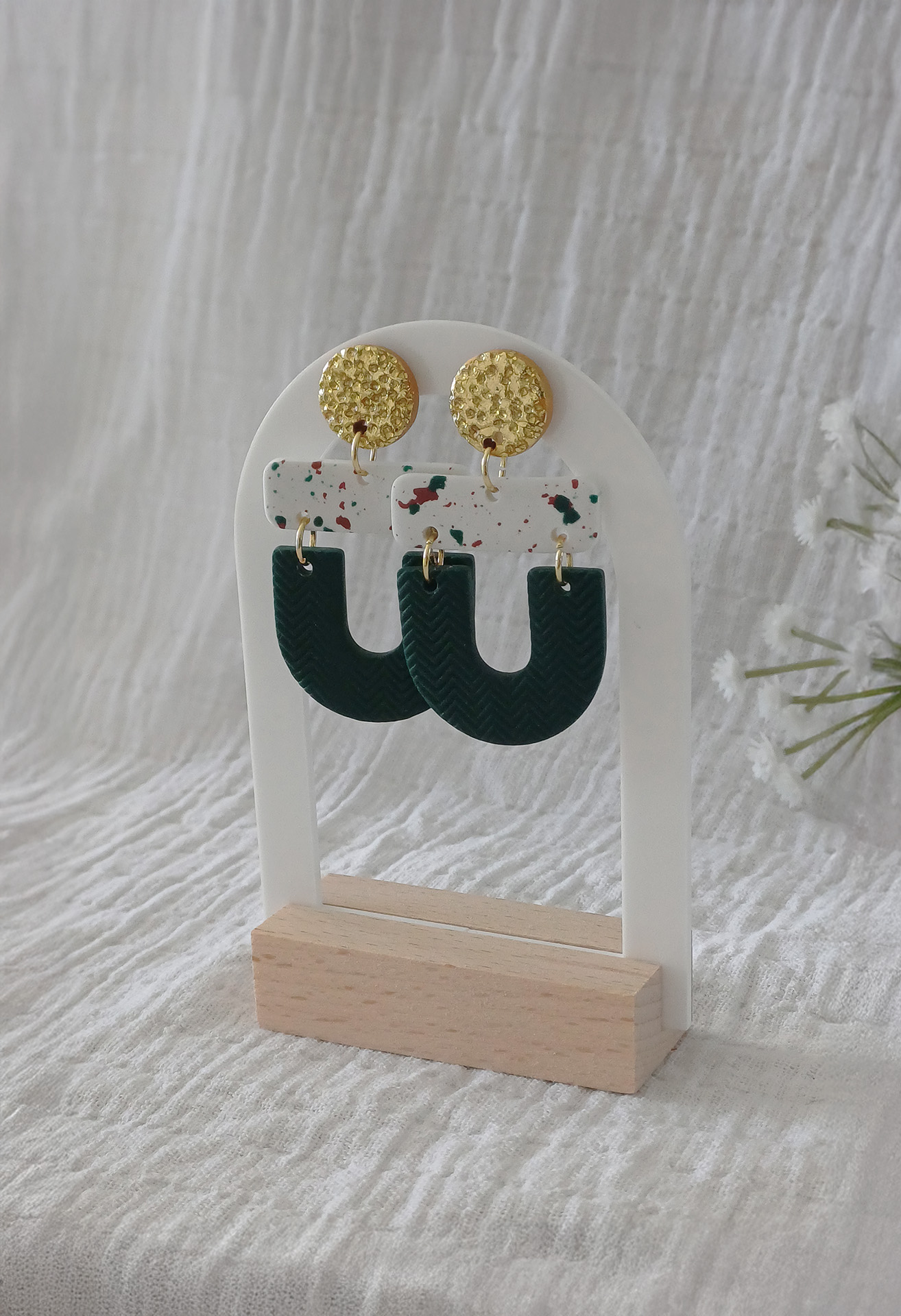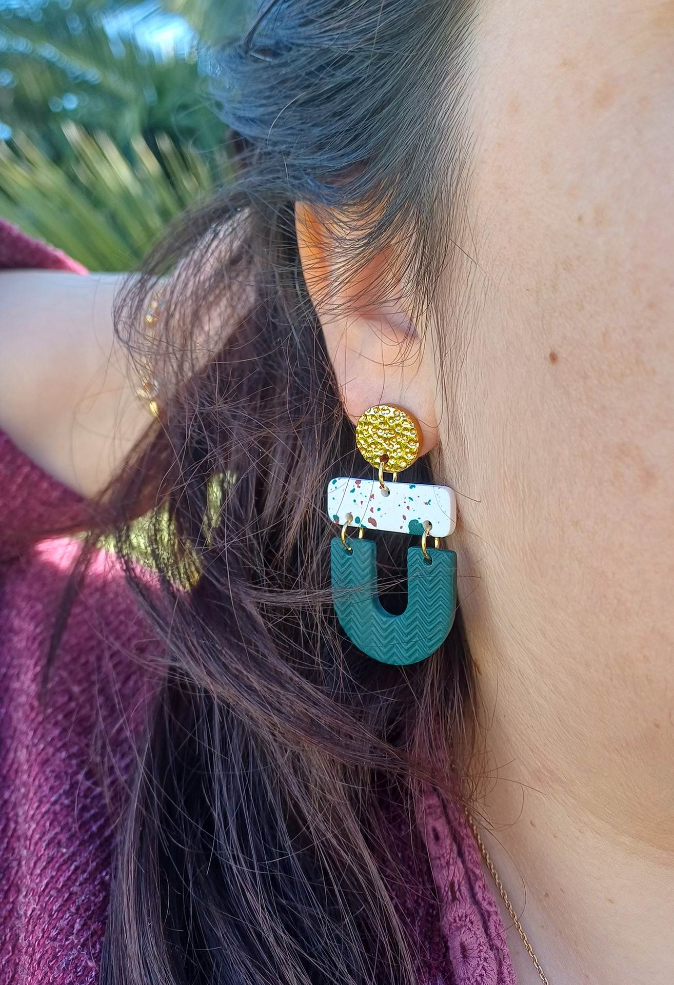 • Les boucles d’oreilles fantaisies Cléo se réinventent dans une version élégante et chaleureuse. Composées de trois éléments: un rond en feuille d’or martelée à la main, une pièce centrale blanche parsemée de copeaux vert et bordeaux, et une arche en U colorée, elles associent contraste et harmonie. Disponibles en deux déclinaisons (bordeaux ou vert), les boucles d’oreilles Cléo offrent une allure audacieuse et raffinée, parfaites pour illuminer vos looks d’hiver comme de fêtes.