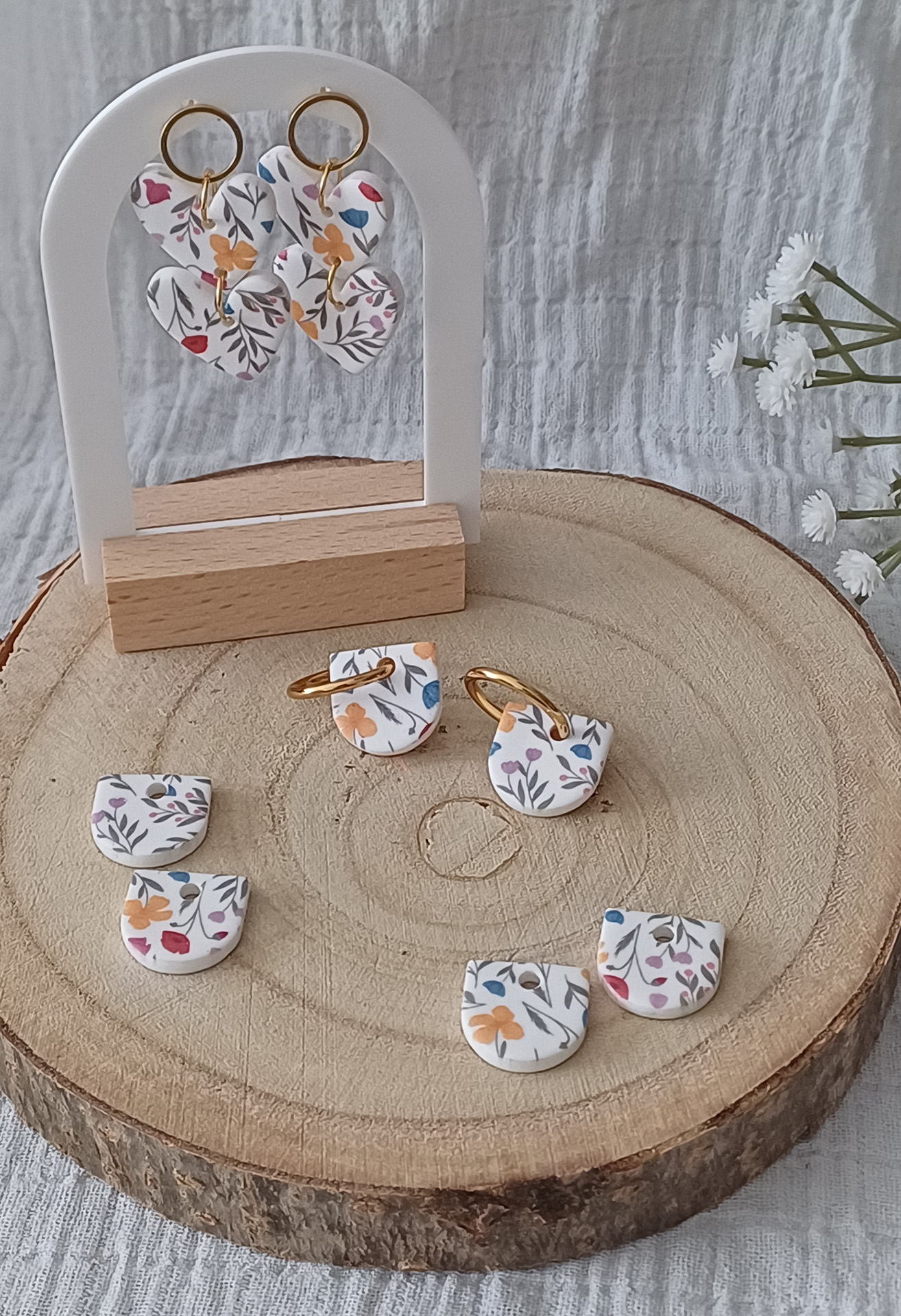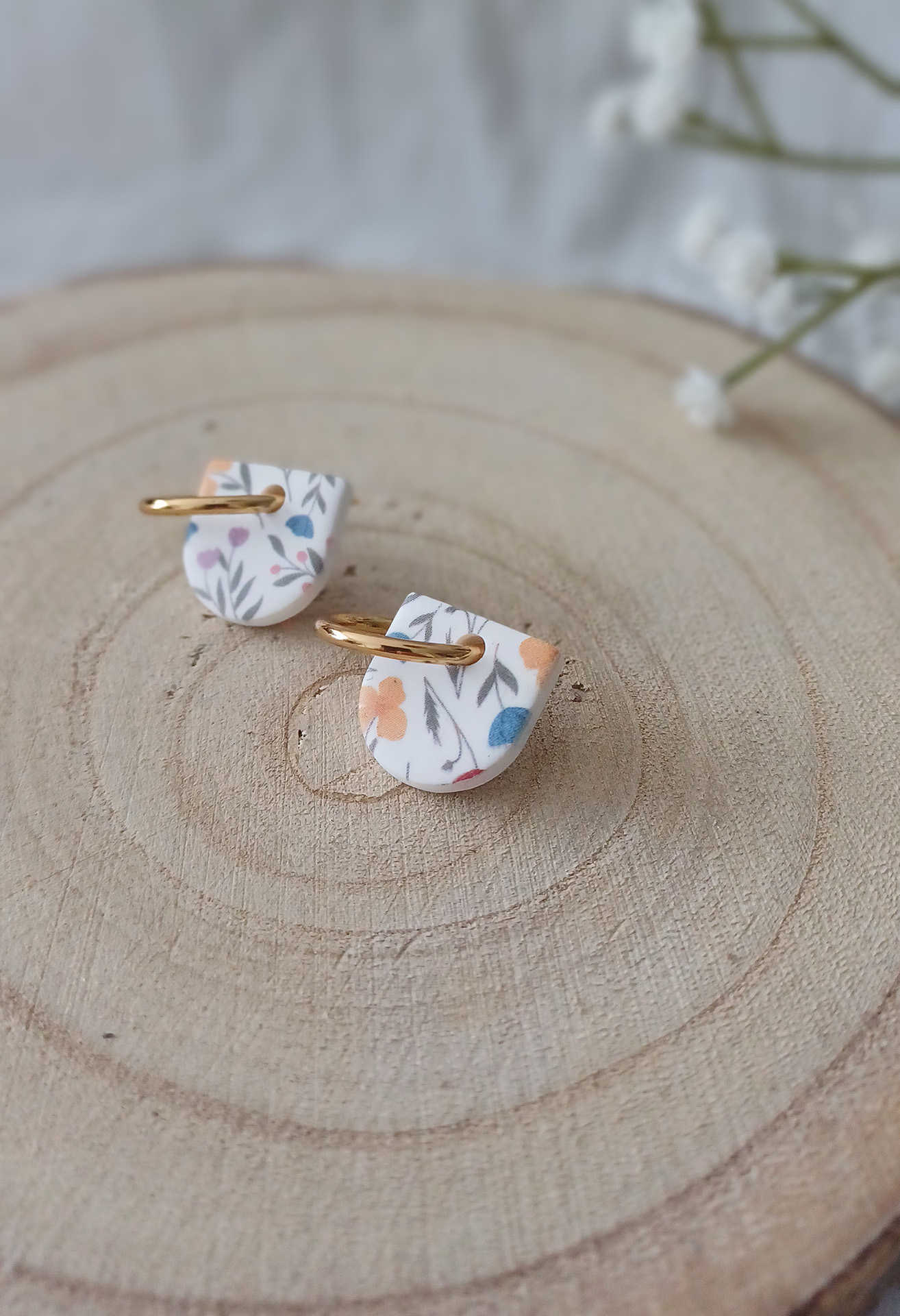 Apportez une touche de poésie à votre tenue grâce aux créoles avec pampille interchangeable, Inès. Ces boucles d’oreilles délicates se distinguent par un demi cercle avec un motif floral rare et breveté aux couleurs douces et apaisantes. Il est posé sur une créole dorée ou argentée, à choisir selon vos préférences. Polyvalentes, ultra légères et confortables, elles sublimeront aussi bien une tenue décontractée qu’un style plus sophistiqué. Les créoles sont en acier inoxydable (sans plomb, sans cadmium, sans nickel), les pampilles, elles, sont faites main en argile polymère.