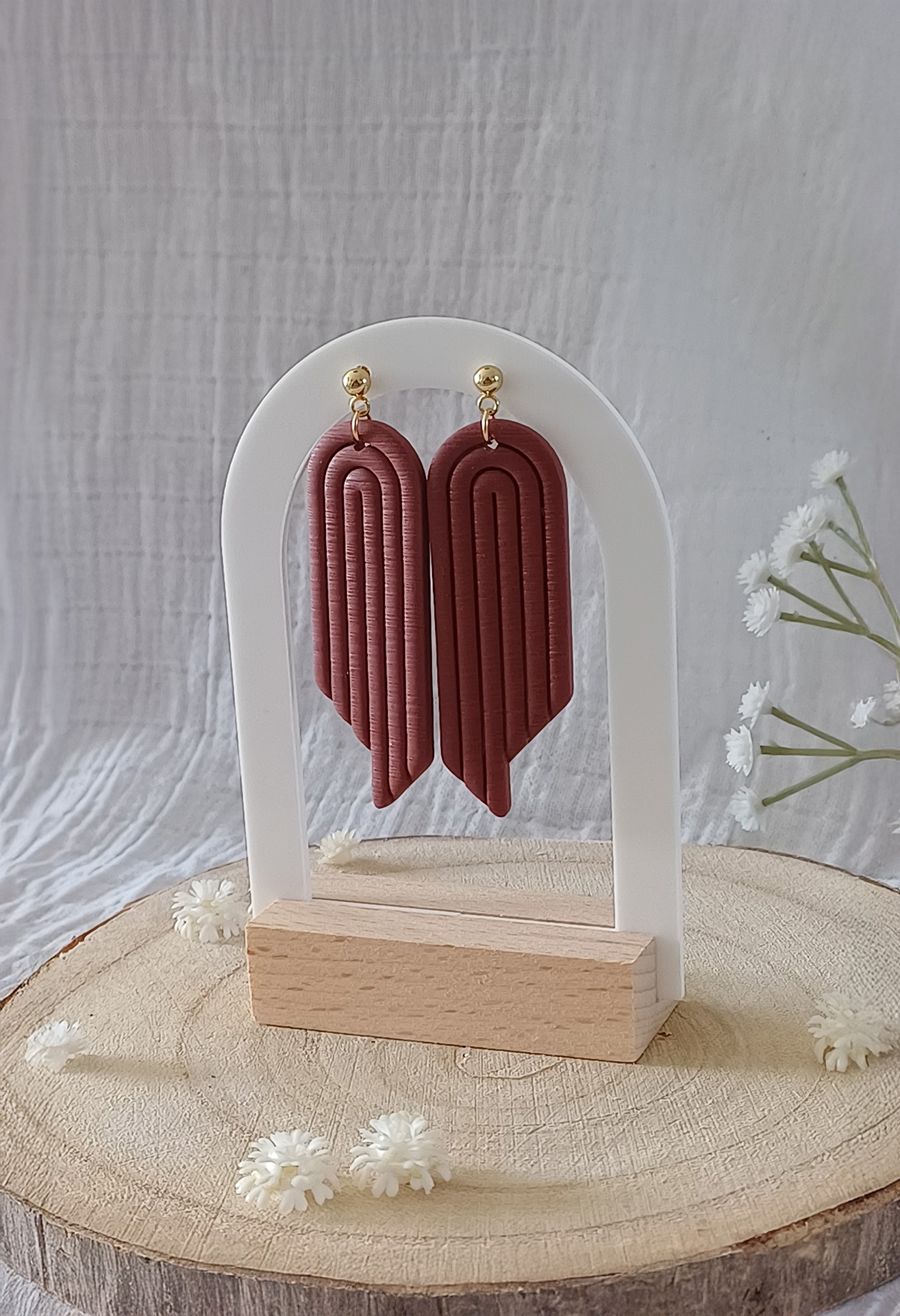 Élégantes et sensuelles, ces boucles pendantes sont composées d’une petite boule en acier inoxydable plaqué or 18k, surmontant un arc en ciel en argile polymère bordeaux.