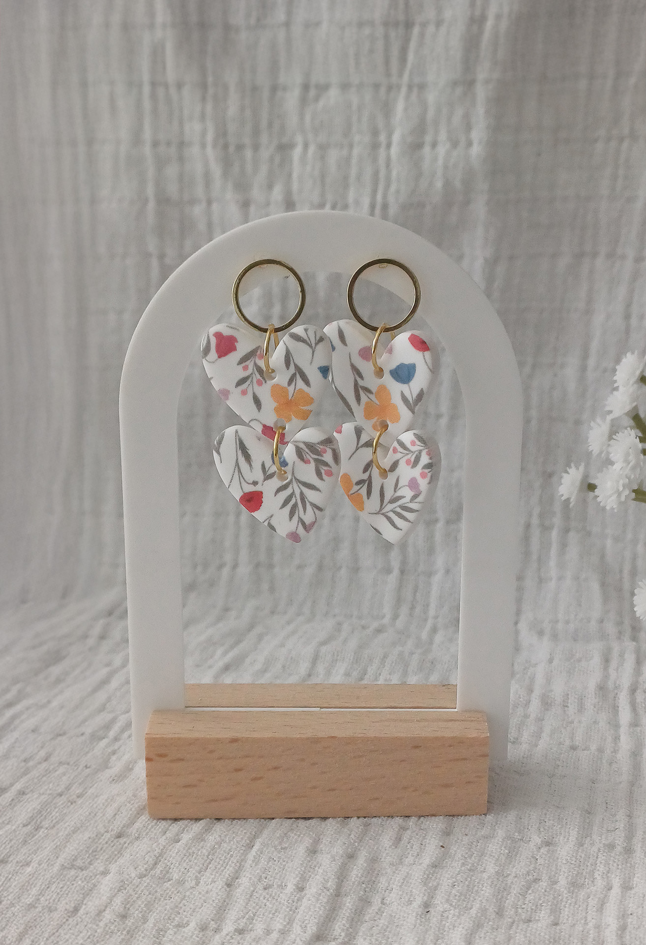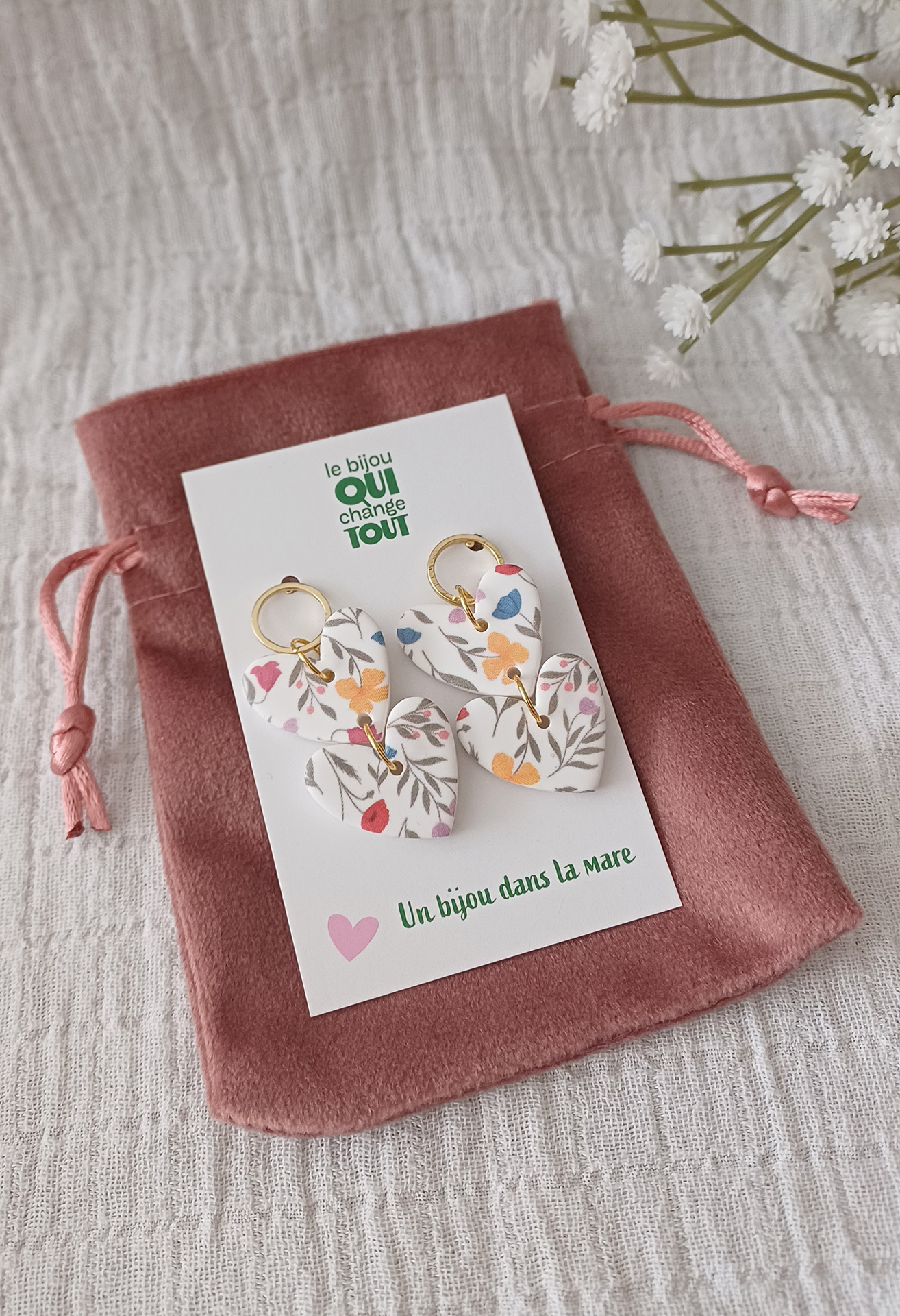Ces boucles d’oreilles pendantes sont composées de trois parties : un cercle en acier inoxydable plaqué or 18k et deux cœurs en argile polymère aux motifs floraux rares et brevetés. Leurs couleurs douces ajoutent une touche de tendresse et de féminité à toutes vos tenues.